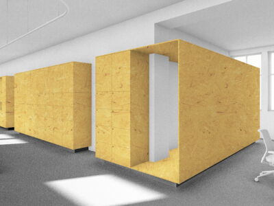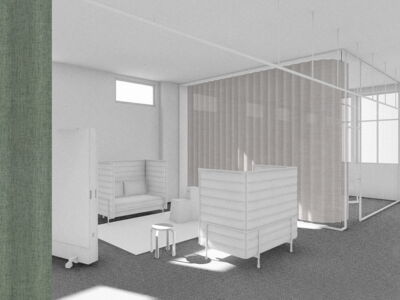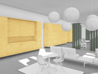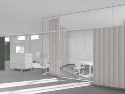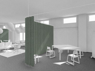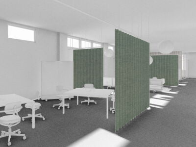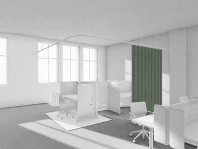 Im Zentrum des alten Postraums steht ein überdimensionales Paket mit Stauraum, Schliessfächern und Telefon-Nischen. Ein Vorhangsystem – angelehnt an das Thema Logistik – schafft flexibel abtrennbare Arbeits- und Besprechungsbereiche. So entstehen Räume für konzentriertes Arbeiten, Besprechungen, Workshops oder Begegnungen.